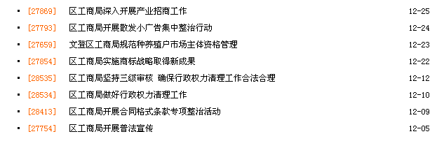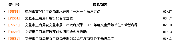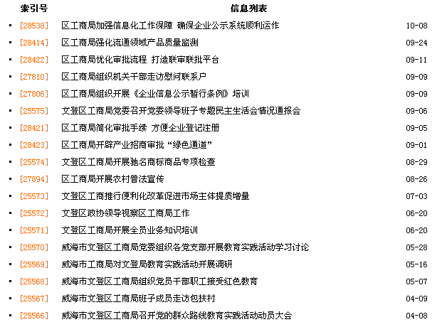 2014年,威海市文登區(qū)工商局共主動(dòng)公開政府信息185條。從內(nèi)容分類看,業(yè)務(wù)工作163條,統(tǒng)計(jì)數(shù)據(jù)13條,其他信息9條;從公開形式上看均為網(wǎng)上公開。在公開平臺(tái)建設(shè)方面,依托“威海市文登區(qū)政府信息公開網(wǎng)這個(gè)平臺(tái)開展信息公開工作的同時(shí),對(duì)文登紅盾信息網(wǎng)進(jìn)行進(jìn)一步更新,為群眾了解工商信息提供方便。
