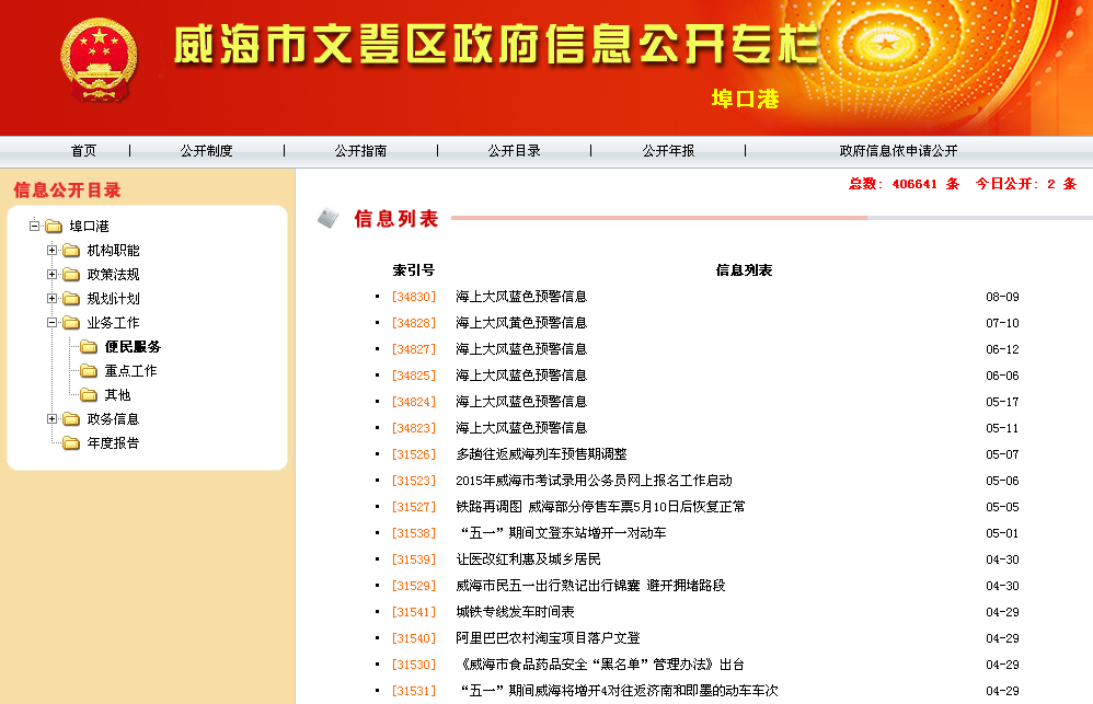 文登埠口港管理委員會(huì)認(rèn)真貫徹落實(shí)《條例》和《辦法》,政府信息公開工作取得重要進(jìn)展。在政府信息公開渠道拓展上,依托互聯(lián)網(wǎng)和業(yè)務(wù)辦事大廳,建立和完善了信息發(fā)布與政府信息公開一體的服務(wù)平臺(tái);在政府信息公開方面,主動(dòng)公開與群眾咨詢公開相結(jié)合,不斷提高辦事處行政透明度和辦事效率;在制度建設(shè)上,繼續(xù)完善各種制度規(guī)章,依法、按時(shí)公開各種政府信息,促進(jìn)政府機(jī)關(guān)依法行政,全面接受社會(huì)監(jiān)督,為公眾提供了比較好的政府信息公開服務(wù)。