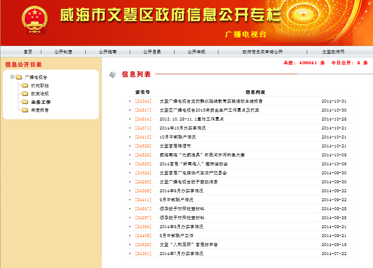 (二)進(jìn)一步完善了各種規(guī)章制度。擬定了政府信息公開(kāi)工作實(shí)施方案和年度工作計(jì)劃,并根據(jù)自身情況完善了《文登區(qū)廣播電視臺(tái)信息公開(kāi)報(bào)送制度》。