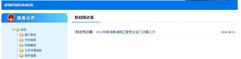 (二)推進(jìn)財(cái)政資金信息公開。認(rèn)真做好政府及部門預(yù)決算和“三公”經(jīng)費(fèi)信息公開工作,通過威海南海新區(qū)政府門戶網(wǎng)站進(jìn)行公開。