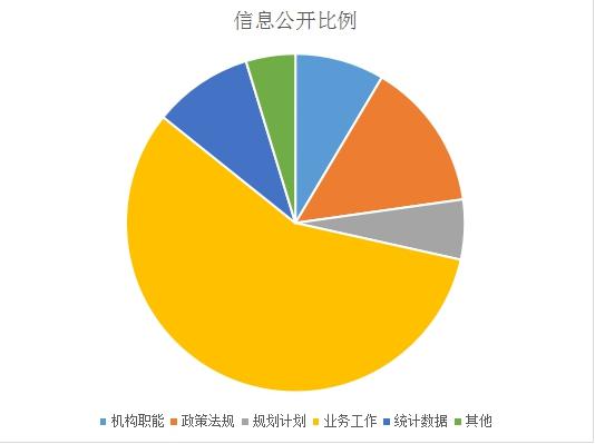 在主動(dòng)公開的信息中,機(jī)構(gòu)職能類信息2條,占8.5%;政策法規(guī)類信息8條,占14.2%,均為規(guī)范性文件和政策性文件;規(guī)劃計(jì)劃類信息6條,占5.7%;業(yè)務(wù)工作類信息56條,占57.1%;統(tǒng)計(jì)數(shù)據(jù)類信息10條,占9.5%;其他類信息5占4.7%。