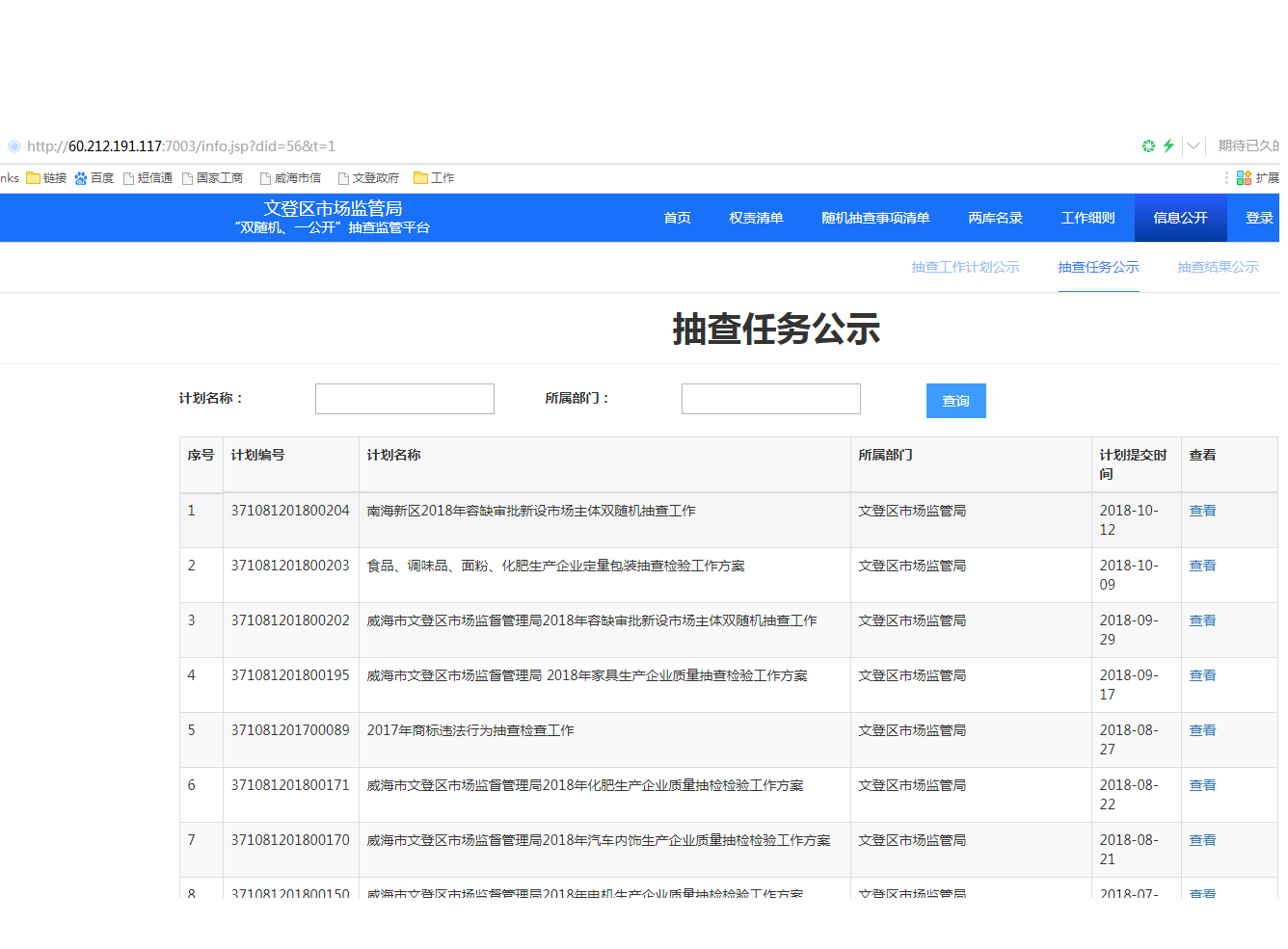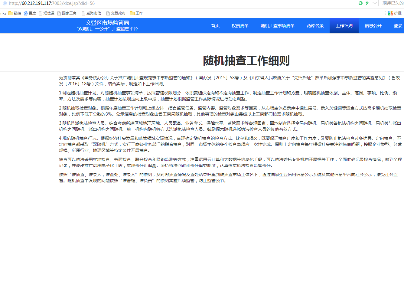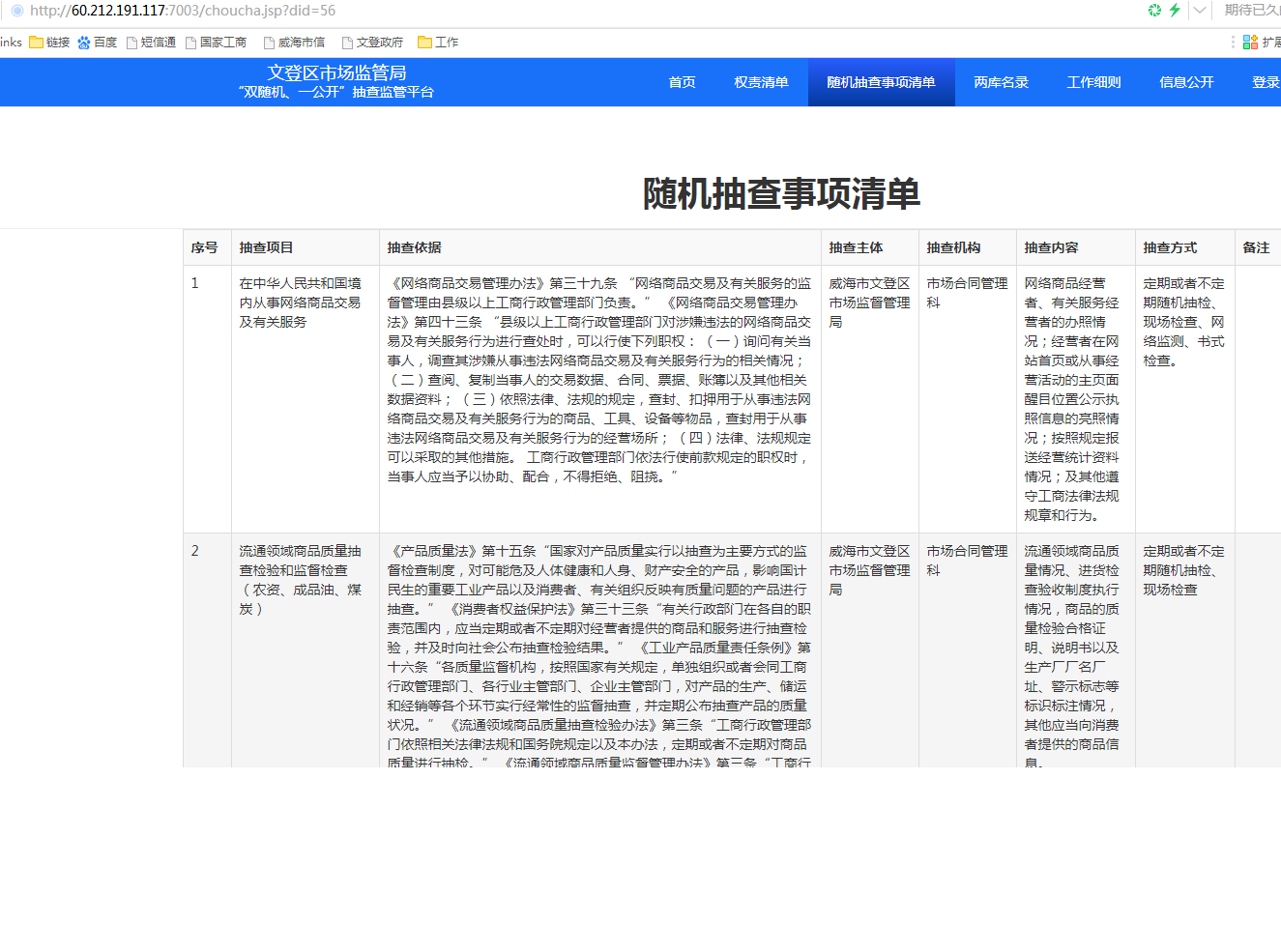 (五)聚焦“放管服”改革做好公開。一是“雙隨機、一公開”監(jiān)管工作。1、督導(dǎo)成員單位高效使用監(jiān)管平臺。全區(qū)37家成員單位結(jié)合權(quán)責(zé)清單確定316項隨機抽查事項,啟用威海市統(tǒng)一的“雙隨機、一公開”監(jiān)管平臺,完成了“一單兩庫一細(xì)則”的數(shù)據(jù)錄入,同時將相關(guān)數(shù)據(jù)在政府信息公開平臺進行公示,實現(xiàn)了行政執(zhí)法事項全覆蓋,改變了以往隨意執(zhí)法的現(xiàn)象,有效規(guī)避了權(quán)力尋租,促進了執(zhí)法監(jiān)管公平公正公開。