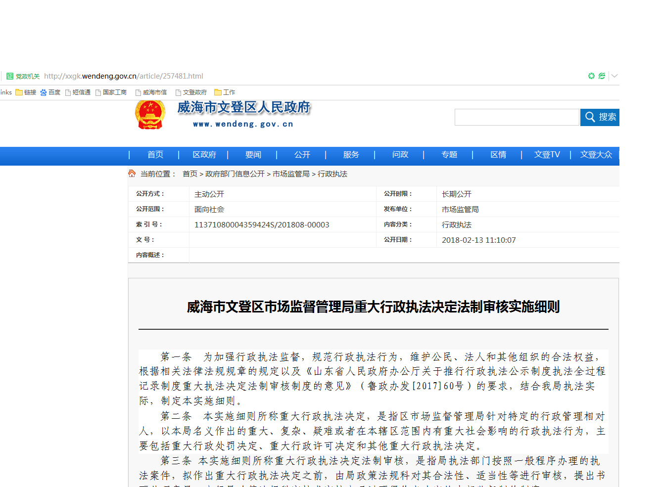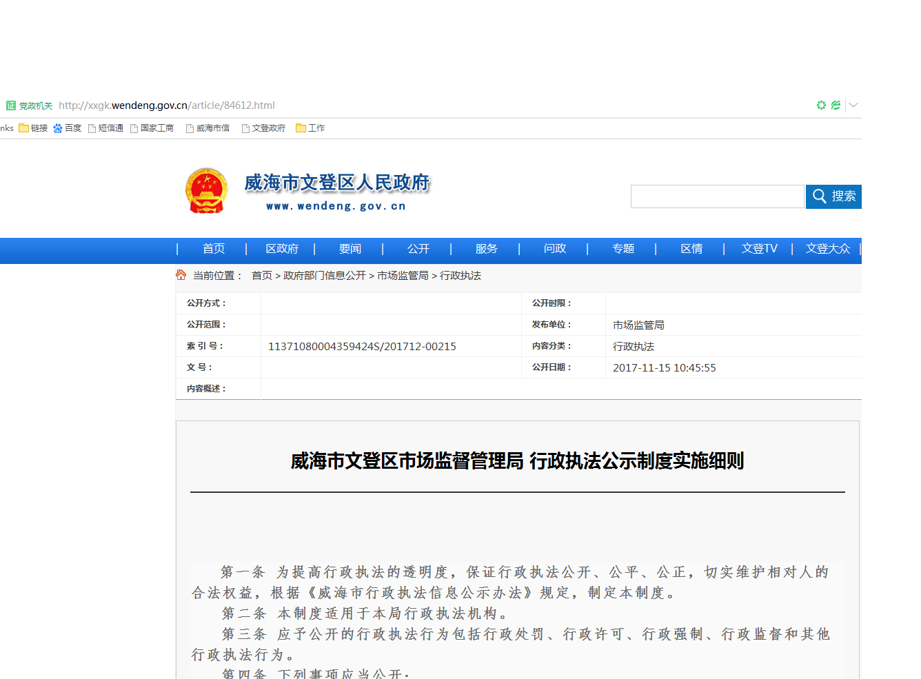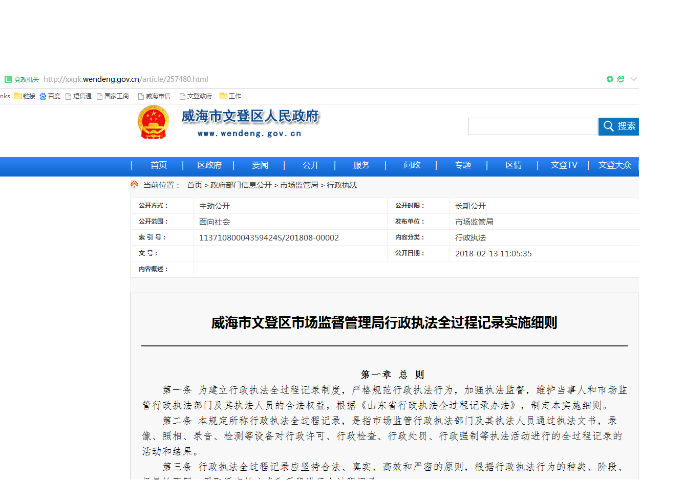 2、貫徹落實行政執(zhí)法制度。制定了《威海市文登區(qū)市場監(jiān)督管理局行政執(zhí)法信息公示制度實施細(xì)則》、《執(zhí)法全過程記錄實施細(xì)則》、《重大執(zhí)法決定法制審核實施細(xì)則》、《重大執(zhí)法決定法制審核目錄》、《重大執(zhí)法決定法制審核要素清單》、《重大執(zhí)法決定法制審核流程圖》等相關(guān)制度文件,通過政務(wù)網(wǎng)站公開,并嚴(yán)格遵照執(zhí)行。