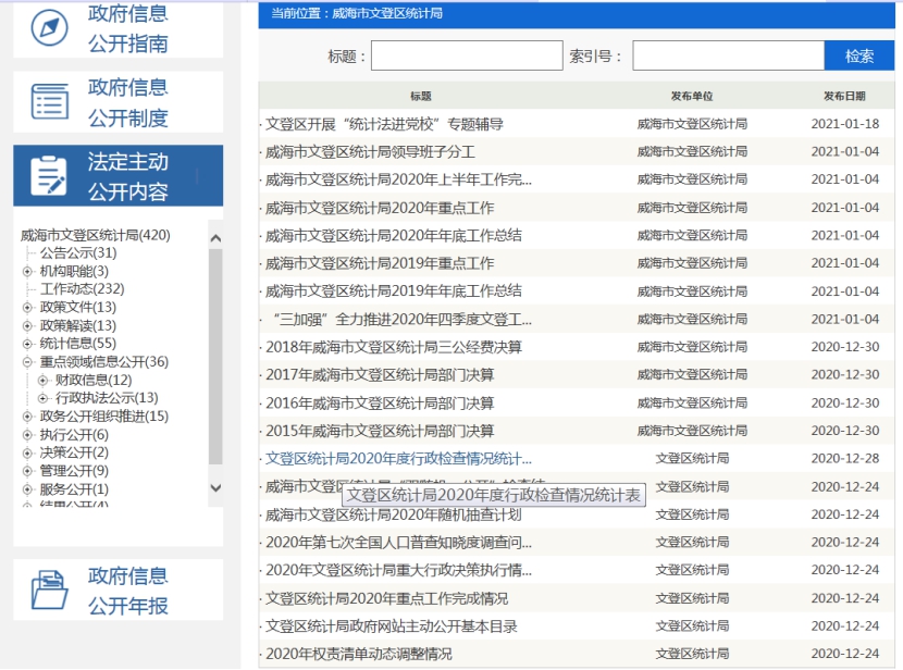 根據(jù)《中華人民共和國政府信息公開條例》(以下簡稱《條例》)、《山東省政府信息公開辦法》和《2020年威海市文登區(qū)政務(wù)公開工作要點的通知》要求,文登區(qū)統(tǒng)計局認(rèn)真落實政務(wù)公開相關(guān)工作,現(xiàn)將2020年度政務(wù)公開工作落實情況匯報如下: