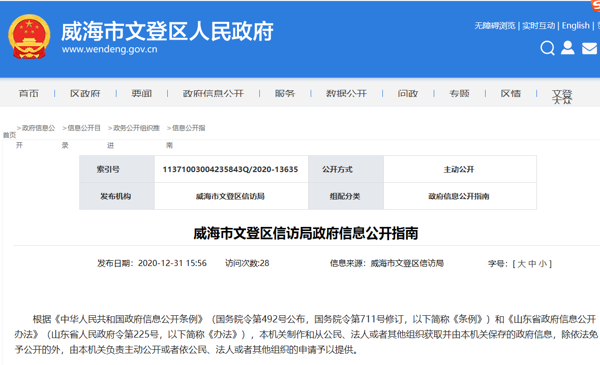 2020年,威海市文登區(qū)信訪局認(rèn)真貫徹落實《中華人民共和國政府信息公開條例》等文件精神,進一步強化組織領(lǐng)導(dǎo),完善工作制度,全面、及時、準(zhǔn)確向全社會公開工作動態(tài)、政策法規(guī)、通知公告等信息,政務(wù)公開工作的覆蓋面進一步拓展,人民在政務(wù)公開方面的互動體驗明顯增強。