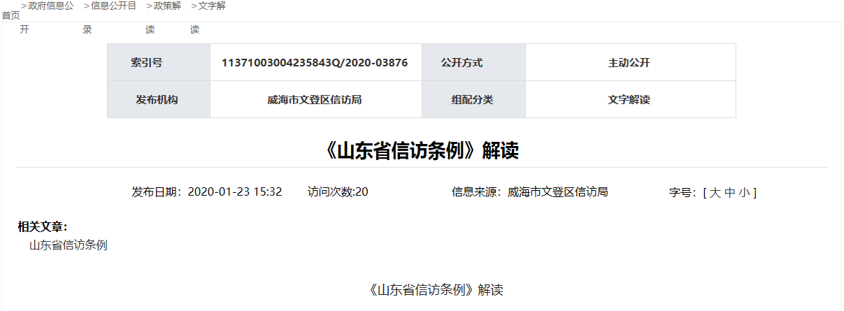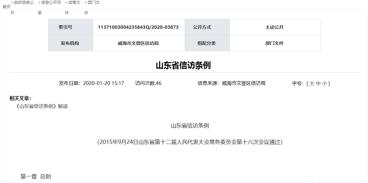 根據(jù)《中華人民共和國政府信息公開條例》(以下簡稱《條例》)和《山東省政府信息公開辦法》(以下簡稱《辦法》)的規(guī)定要求,現(xiàn)公布威海市文登區(qū)信訪局2020年度政府信息公開工作報告。