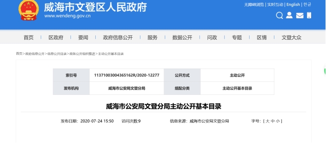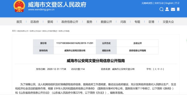2020年,威海市公安局文登分局根據《條例》、《辦法》和文登區(qū)政府有關要求,通過威海市文登區(qū)人民政府門戶網站、文登警方在線微信公眾號、窗口單位信息公開板等公開渠道,為公眾提供各種形式的政府信息公開服務,不斷提升政務公開工作質量。
