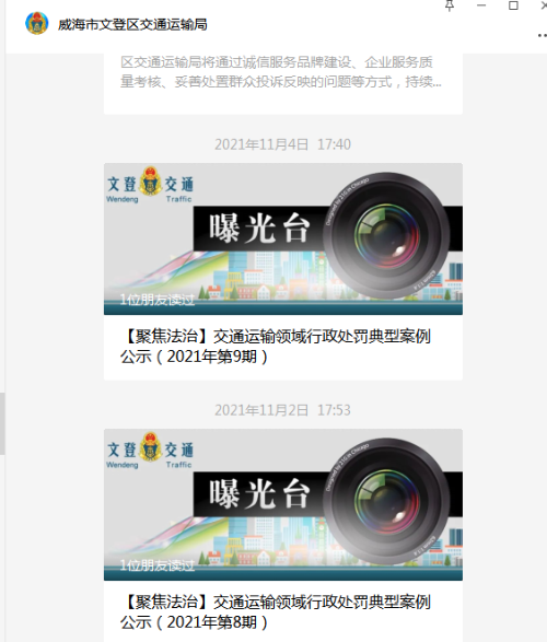 本年度,依托局微信公眾號,區(qū)交通運(yùn)輸局開通了交通運(yùn)輸局領(lǐng)域行政處罰曝光臺,在微信公眾號自主菜單欄設(shè)置了查詢服務(wù),提供社會大眾法律查詢、運(yùn)政查詢、標(biāo)準(zhǔn)化查詢、危險品查詢等功能。