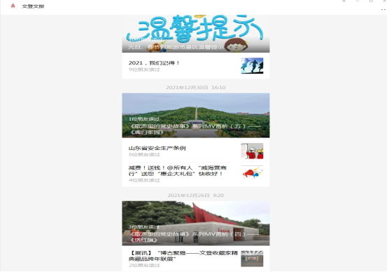 我局立足威海市文登區(qū)人民政府門(mén)戶網(wǎng)站,將報(bào)刊、報(bào)紙等傳統(tǒng)媒介與微信公眾號(hào)等政務(wù)新媒體高度結(jié)合,逐步構(gòu)建起完善、規(guī)范、公開(kāi)、透明的政府信息公開(kāi)立體體系。2021年度,我局微信公眾號(hào)(文登文旅)累計(jì)發(fā)布信息443篇。舉辦新聞發(fā)布會(huì)2場(chǎng),介紹文登區(qū)公共文化服務(wù)體系建設(shè)情況并答記者問(wèn)、以及區(qū)政府新聞辦舉行“十三五”成就巡禮。參與“辦好民生實(shí)事”系列訪談1場(chǎng),介紹文登在打造精致城市、推進(jìn)鄉(xiāng)村振興,提升公共文化服務(wù)建設(shè)、在各項(xiàng)活動(dòng)中積極融合黨史學(xué)習(xí)教育等的建設(shè)進(jìn)展。