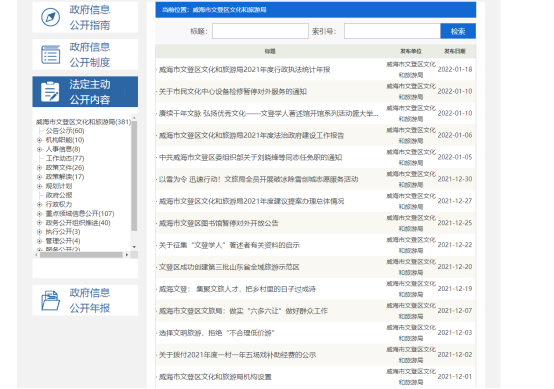 2021年,文登區(qū)文化和旅游局充分利用政府網(wǎng)站、微信公眾平臺(tái)對(duì)外公開(kāi)文旅信息。我局通過(guò)政務(wù)網(wǎng)站發(fā)布包括:主動(dòng)公開(kāi)工作動(dòng)態(tài)、公告公示、重點(diǎn)領(lǐng)域信息、政策文件及解讀等各類政府信息104條,及時(shí)、全面、規(guī)范、透明地主動(dòng)公開(kāi)相關(guān)政府信息。