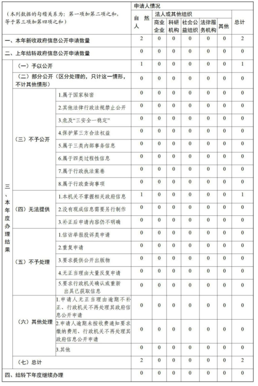 收到政府信息公開(kāi)申請(qǐng)2項(xiàng),涉及申請(qǐng)公開(kāi)集體土地征收相關(guān)材料和企業(yè)職工基本養(yǎng)老保險(xiǎn)遺屬待遇文件等。其中,予以公開(kāi)1件,占比50%;無(wú)法提供1件,占比50%,為本機(jī)關(guān)不掌握相關(guān)政府信息。本年度,依申請(qǐng)公開(kāi)政府信息未收取任何費(fèi)用,沒(méi)有因政府信息公開(kāi)引起行政復(fù)議糾錯(cuò)和行政訴訟敗訴的情形。