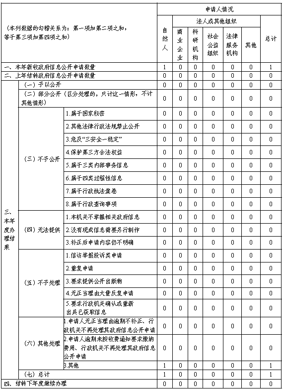 2022年度,我局共受理政府信息公開(kāi)申請(qǐng)1件,比去年增加1件,申請(qǐng)內(nèi)容涉及機(jī)構(gòu)改革相關(guān)情況,屬于黨務(wù)信息無(wú)法提供。本年度,依申請(qǐng)公開(kāi)政府信息未收取任何費(fèi)用,沒(méi)有因政府信息公開(kāi)引起行政復(fù)議糾錯(cuò)和行政訴訟敗訴的情形。