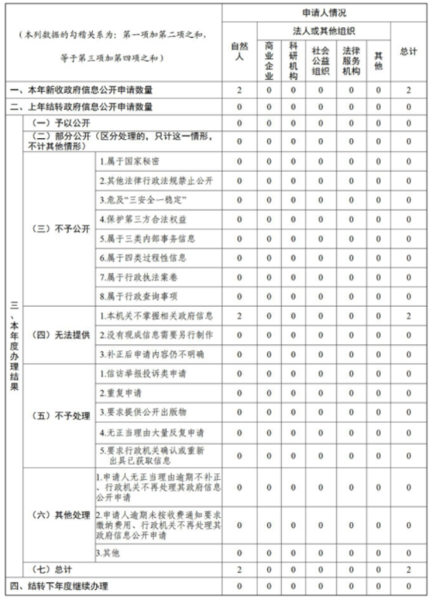 我局2022年新受理答復(fù)政府信息公開申請(qǐng)2件,均已按時(shí)根據(jù)《條例》予以答復(fù),對(duì)比去年數(shù)據(jù)有所減少,未產(chǎn)生收費(fèi)情況,未產(chǎn)生行政復(fù)議和行政訴訟情況。