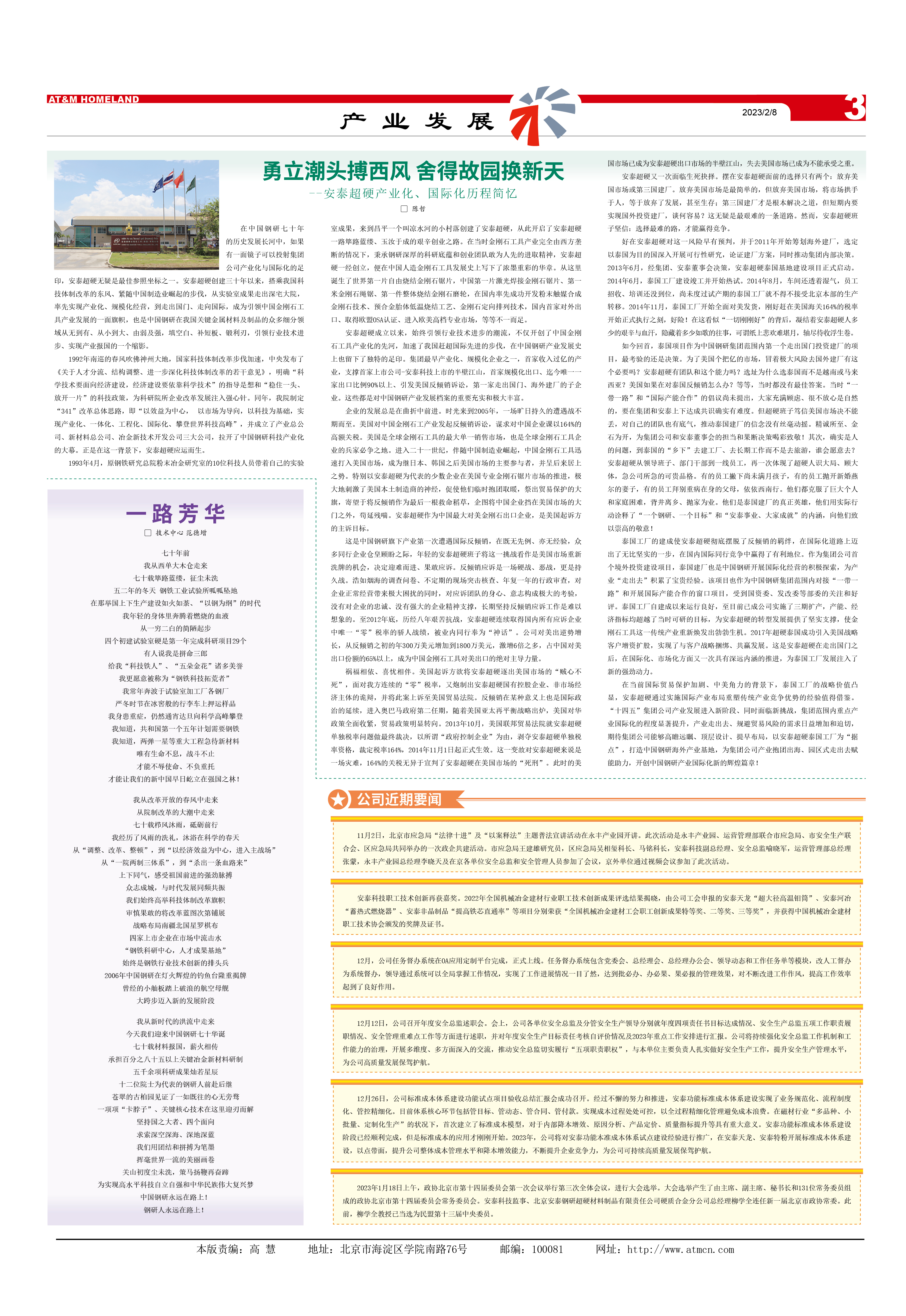 在中國鋼研七十年的歷史發(fā)展長河中,如果有一面鏡子可以投射集團(tuán)公司產(chǎn)業(yè)化與國際化的足印,安泰超硬無疑是最佳參照坐標(biāo)之一。安泰超硬創(chuàng)建三十年以來,搭乘我國科技體制改革的東風(fēng)、緊隨中國制造業(yè)崛起的步伐,從實驗室成果走出深宅大院,率先實現(xiàn)產(chǎn)業(yè)化、規(guī)?;?jīng)營,到走出國門、走向國際,成為引領(lǐng)中國金剛石工具產(chǎn)業(yè)發(fā)展的一面旗幟,也是中國鋼研在我國關(guān)鍵金屬材料及制品的眾多細(xì)分領(lǐng)域從無到有、從小到大、由弱及強(qiáng),填空白、補(bǔ)短板、鍛利刃,引領(lǐng)行業(yè)技術(shù)進(jìn)步、實現(xiàn)產(chǎn)業(yè)報國的一個縮影。